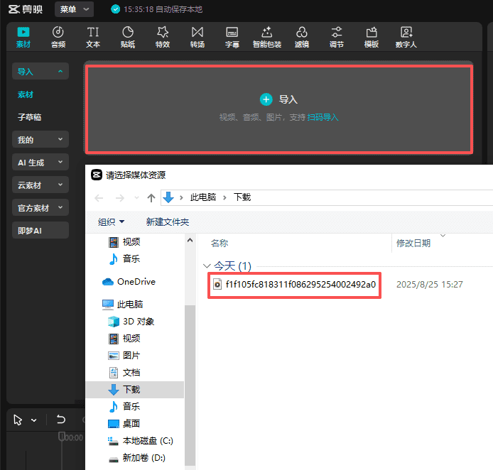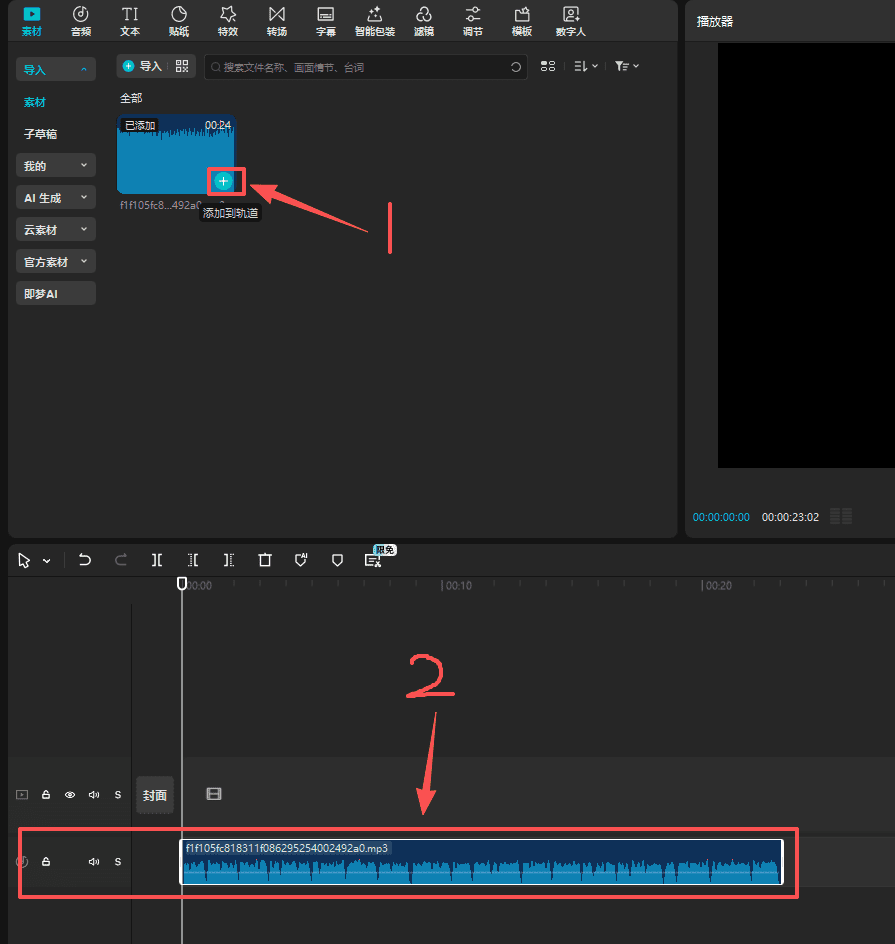 1、导入素材点击导入,将生成的配音,先添加进来(点击图片可以放大查看)