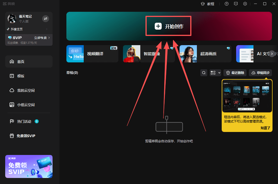 3. 剪辑打开剪映(手机端直接在应用商店搜索下载安装,电脑端直接百度搜索,进入官网,下载安装),点击开始创作(点击图片可以放大查看)