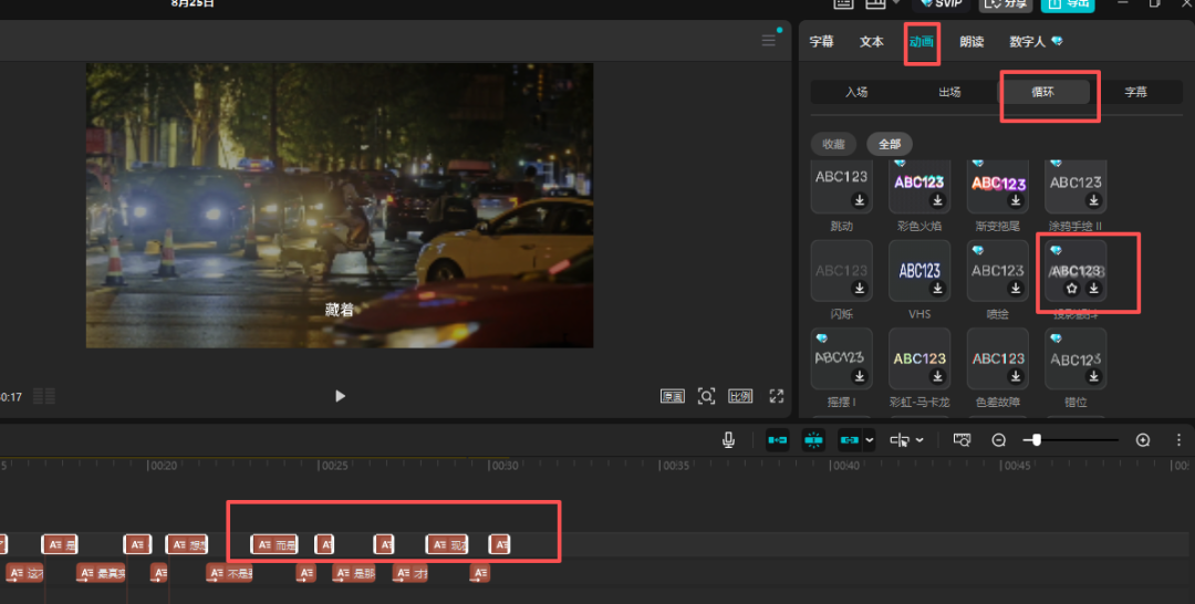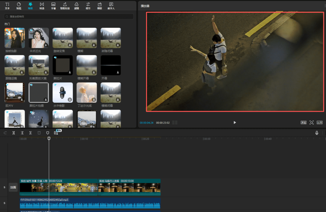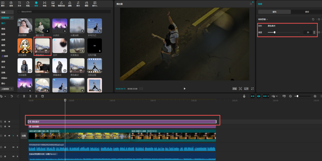 为了让视频看起来更有氛围感,我们可以适当的加一些特效,比如「抽帧」这个增加一些抽帧模糊(点击图片可以放大查看)