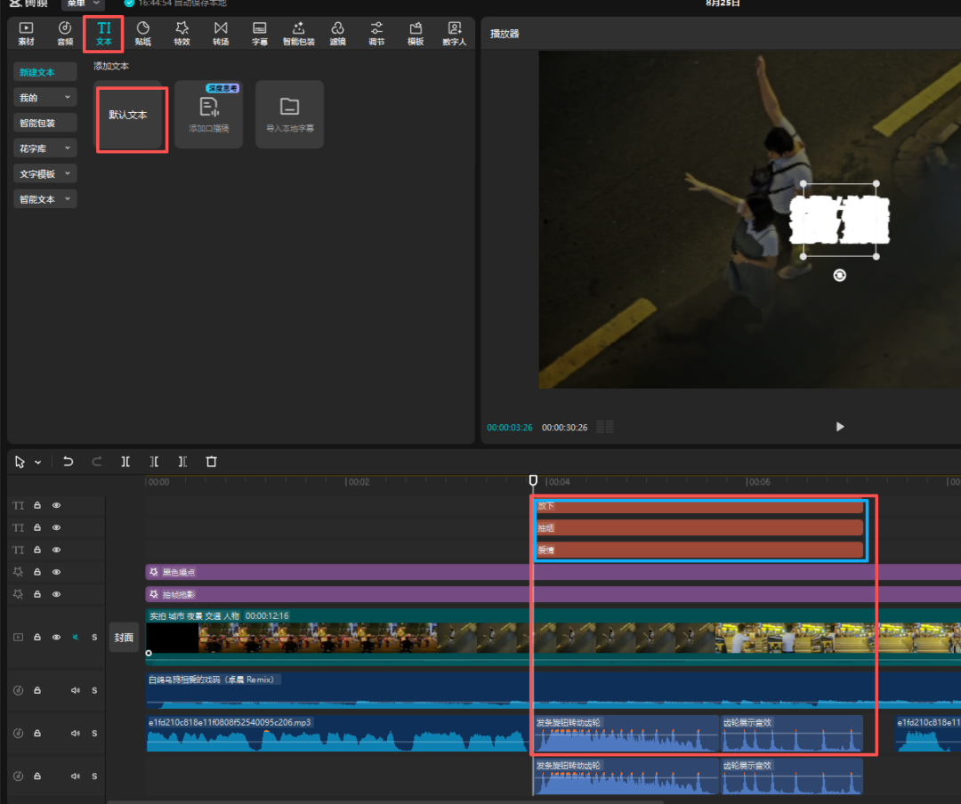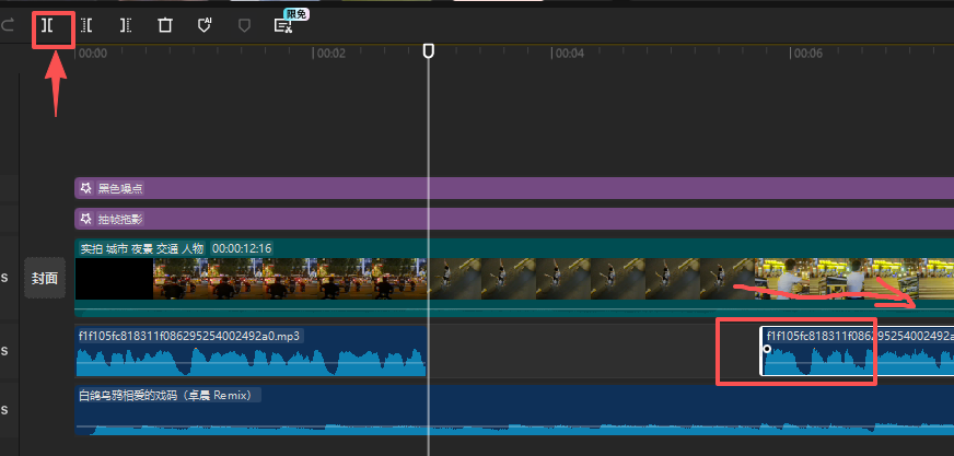 关于素材,可以去抖音上搜一些相关的视频画面,比如西安城市全景,空镜头,肉夹馍,biangbiang面等,添加到主轨道上(点击图片可以放大查看)然后选择音频,添加背景音乐,搜索【白鸽乌鸦相爱的戏码】(点击图片可以放大查看)