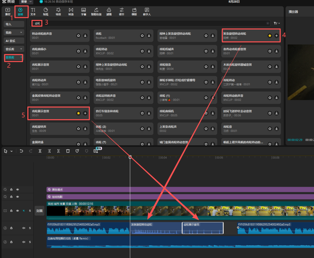 接着在中间空出来的位置,添加齿轮转轮的音效点击音频,音效,搜索齿轮,添加两个一长一短(点击图片可以放大查看)