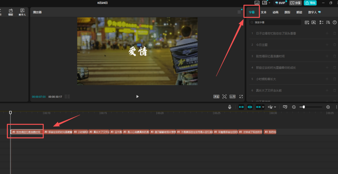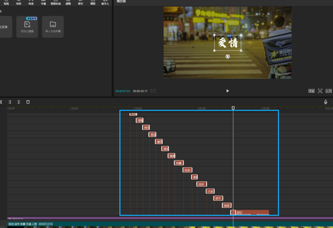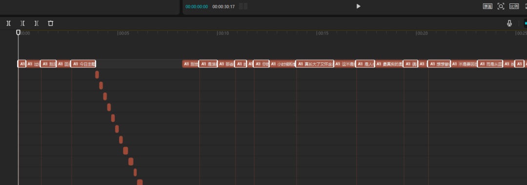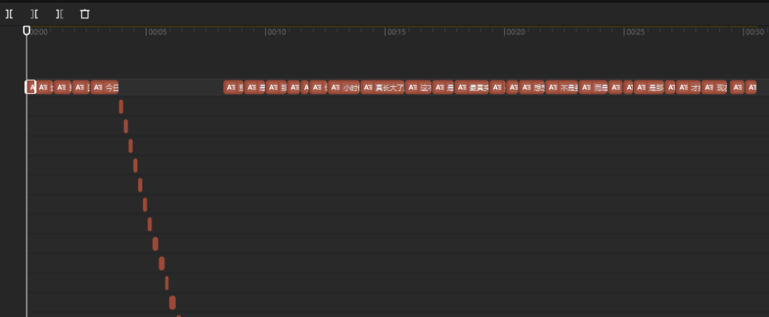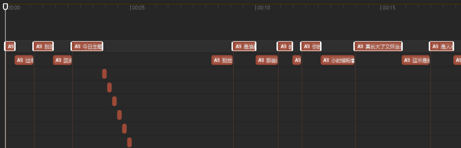 都分割好以后,就要开始对字幕做动画效果了此时,字幕编辑区显示的是这样的(点击图片可以放大查看)