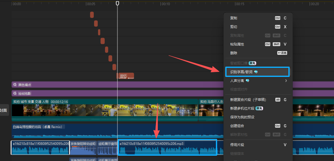 齿轮转动的效果最好以后接下来就是识别字幕选中配音的音频轨道,鼠标右键点击一下,选择识别字幕(点击图片可以放大查看)