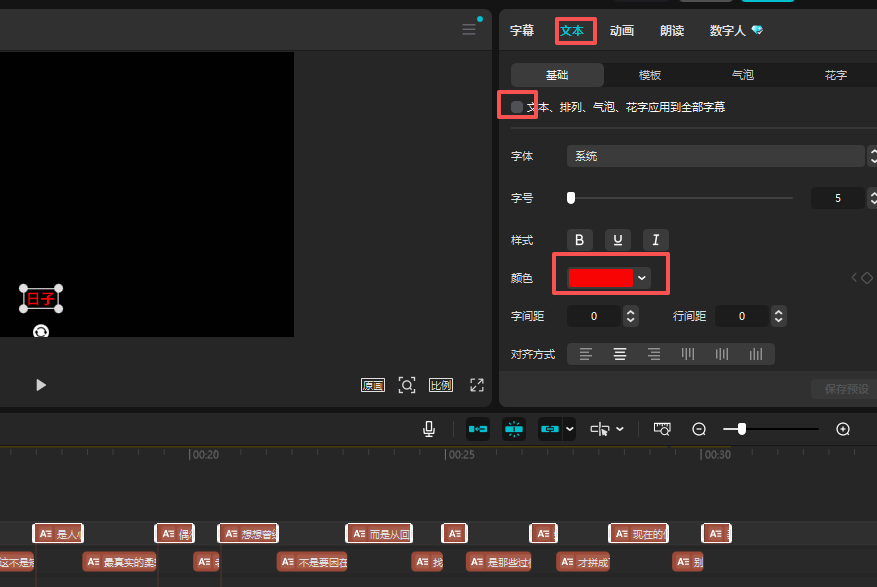 然后就是给字幕换字体以及颜色,上面一行的字幕可以是红色的,下面的保持白色这里需要注意的是 将文本前面的 对勾 取消掉不然你操作某一句话的字体颜色 等 就直接应用到所有字幕了