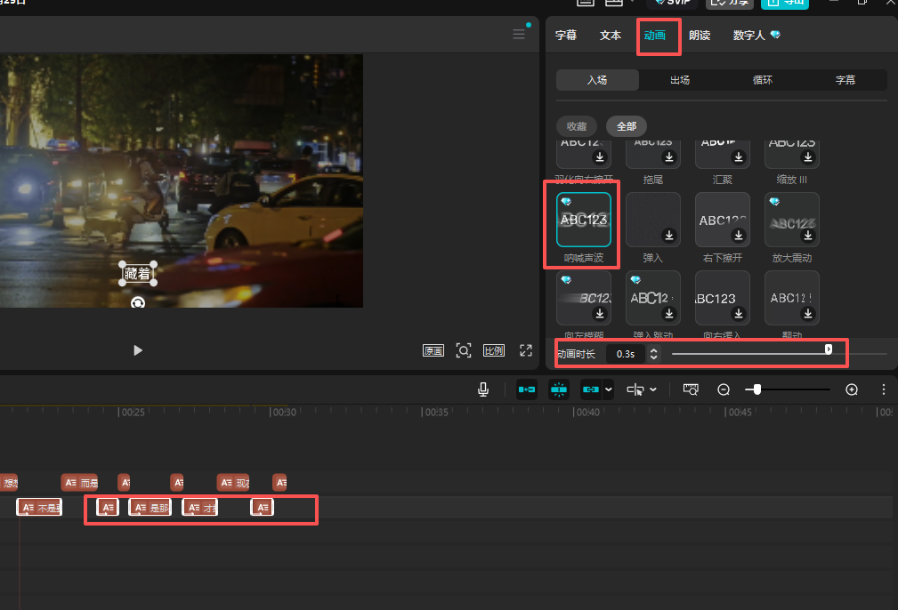 然后就是开始对每句话进行出场入场的动画效果了就是根据自己的喜好去做就行了如果想图省事儿那就先全选下面一行字幕,选择动画,入场,呐喊声波