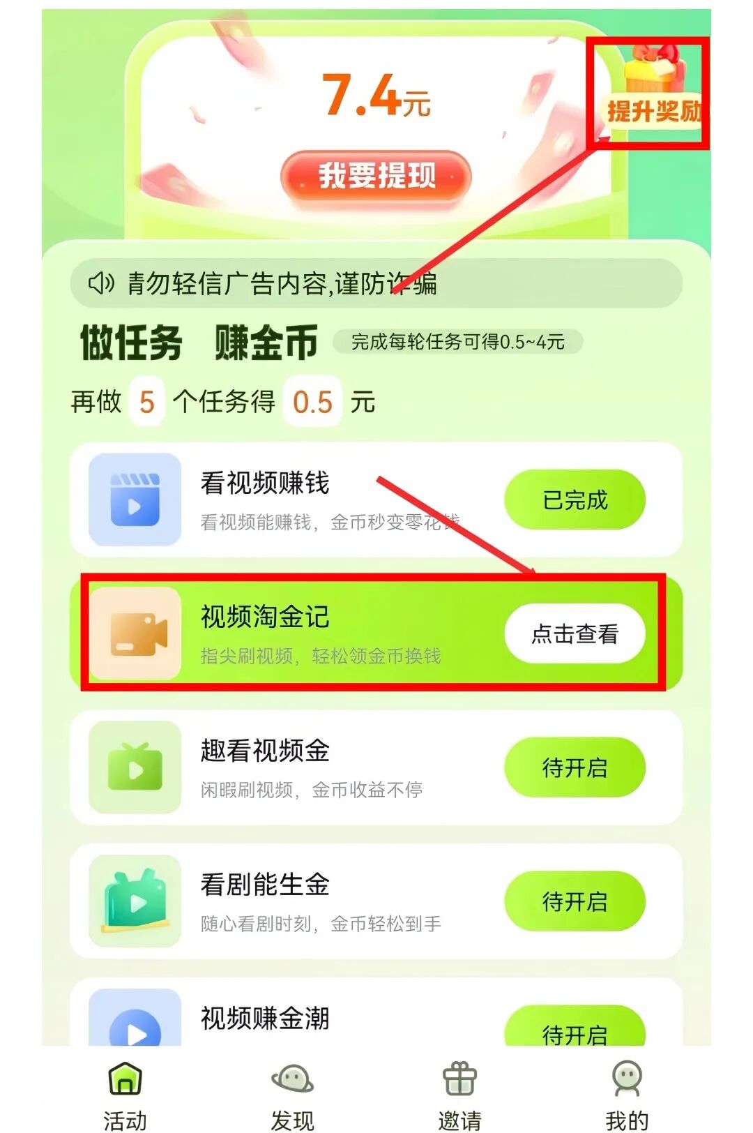 不过该平台有两个版本,第一个是顶包2w金币红色版本,第二个就是上文提到的绿色版本,大家选择自己喜欢的做就好进入平台后点击“活动”就能开始看视频撸收益了,如果收益较低,可以点击“提升奖励”按钮,能大大提高收益,亲测管用二、TRD和上一个平台一样,都是看广告视频拿收益,不过界面有所不同,该平台是经典的“红包群”界面,里面每隔几秒就会弹出类似微信红包图标,点击后就会跳出一个15~30秒广告视频,看完就能拿到2000金币,并且还有“双倍奖励”活动,再看一个视频就能直接变为4000金币,也就是0.4米