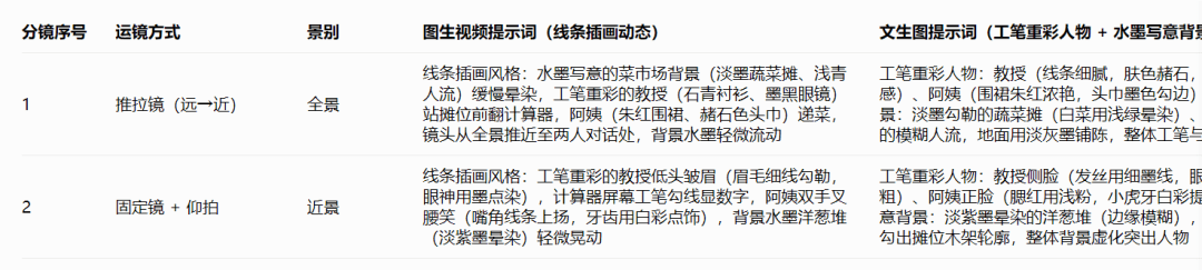 根据生成的文案,帮我生成10组对应的分镜头脚本,要求提供运镜,景别,图生视频提示词,文生图提示词,图片要线条插画风格,主体人物采用工笔重彩技法,背景采用水墨写意技法,人物与背景风格要保持一致,以表格形式提供。
