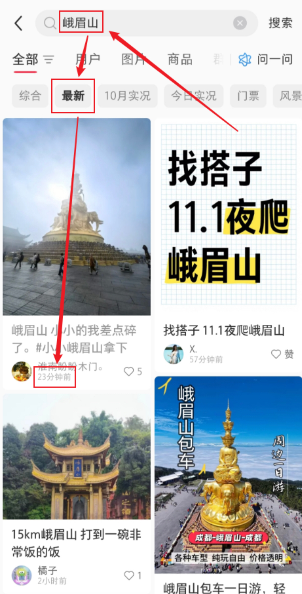 实在不会就去小红书搬运,可在小红书等平台搜索目标景点(如峨眉山、乐山大佛),将 “综合” 筛选切换为 “最新”,参考 2 小时内发布的优质笔记