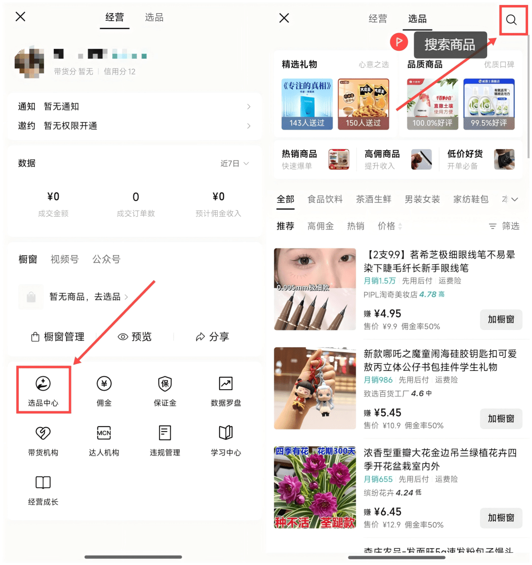 0粉就能开通橱窗,就算你后面不做了,也可以申请注销,100元保证金也可以退回来。第三步、选品因为我们没有货源,做的是带货达人,所以我们要去选品中心选品,优先选择店铺评分高的。