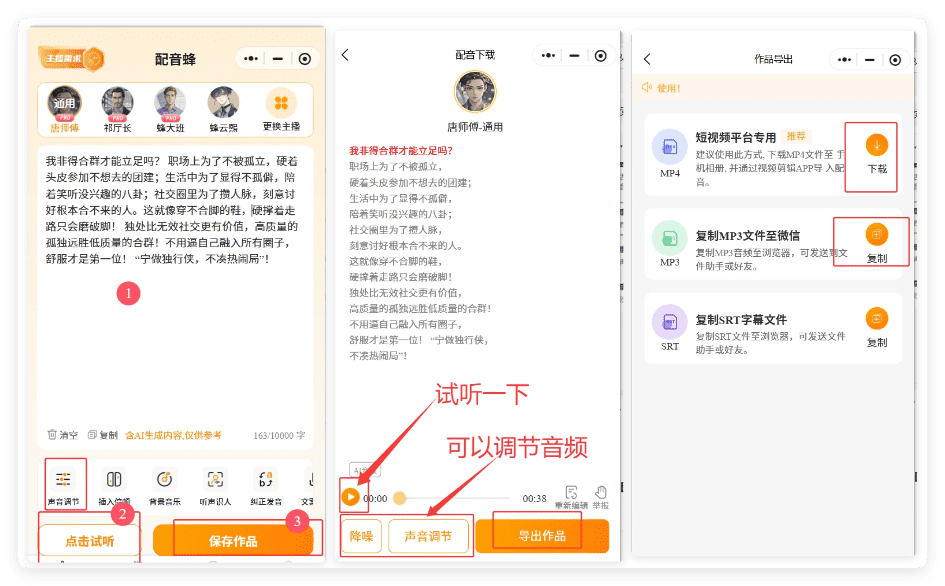 2 输入文案 点击试听,保存作品,试听一下,导出后下载音频