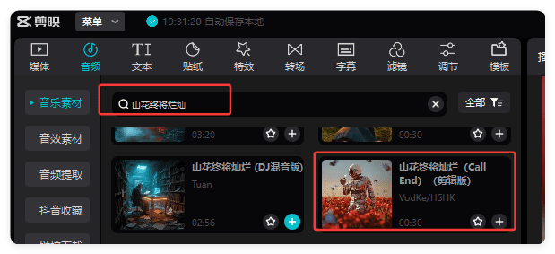1.把配音和视频素材导入剪映,添加一个背景音乐“山花终将灿烂”