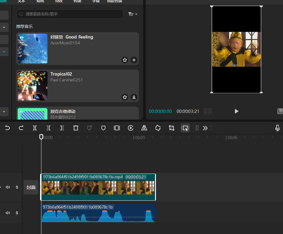 即梦的数字人功能,在上传音频时最多支持15秒,所以我们需要把我们保存的视频素材先裁剪,然后分离音频出来。这里用剪映:上传素材–点击素材轨道 右键–分离音频,