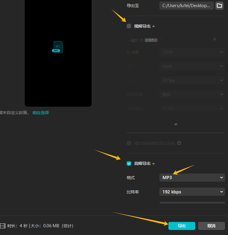 导出的时候,不要勾选【视频导出】,选择【音频导出】MP3,