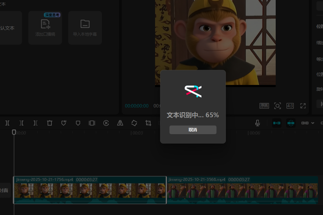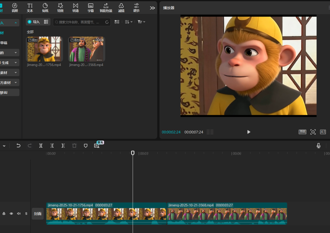 把所有片段依次生成之后,导入剪映,剪辑拼接,