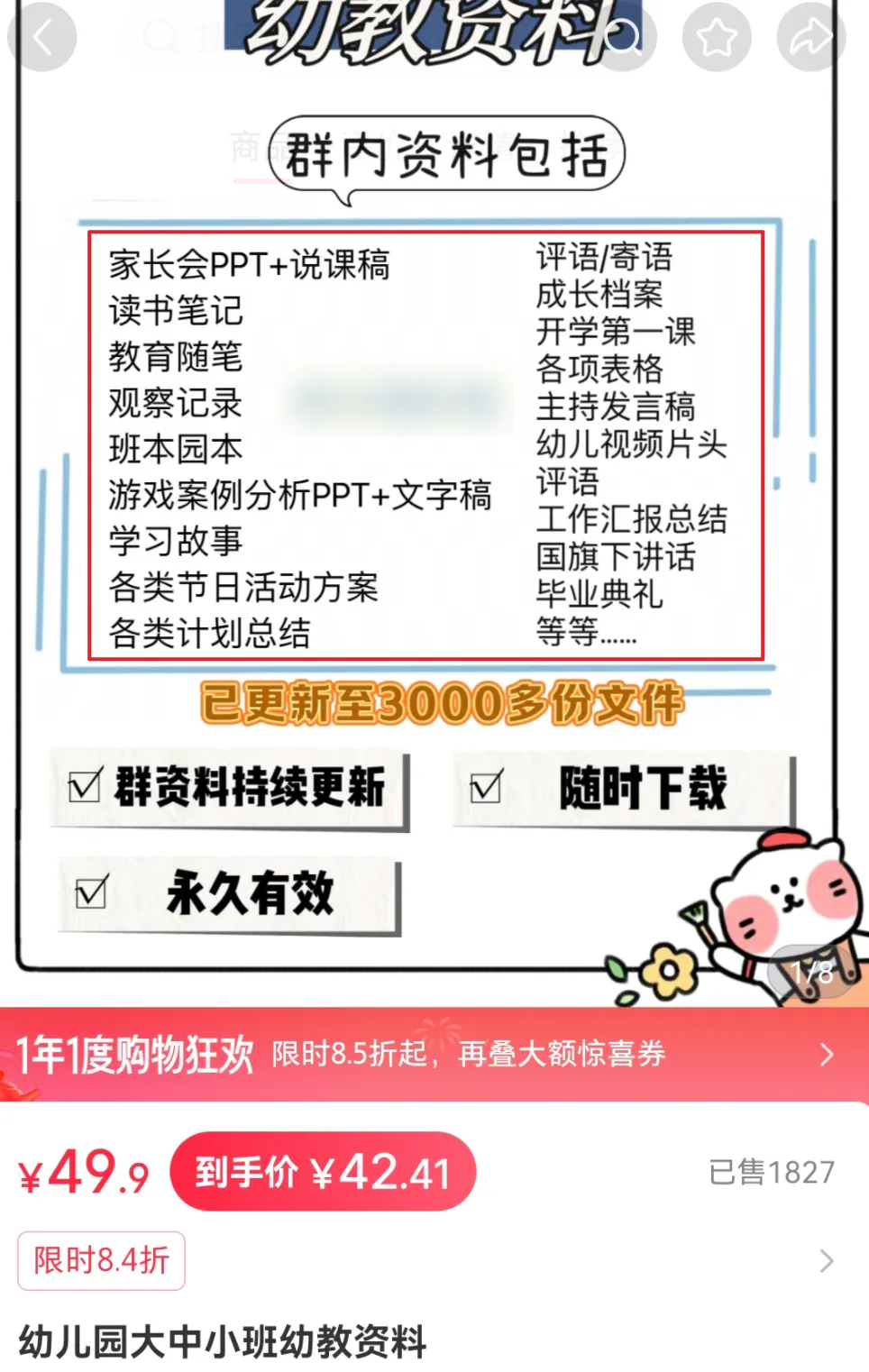 先看一个单品爆款:客单价50元,销量1300+,纯利润直接突破6W+!这个爆款卖的就是幼儿园游戏PPT资料,关键玩法是“合集+每月更新”。对虚拟产品来说,“时效性”是核心竞争力,定期更新能让用户明确感知到资料的新鲜度,自然愿意买单。