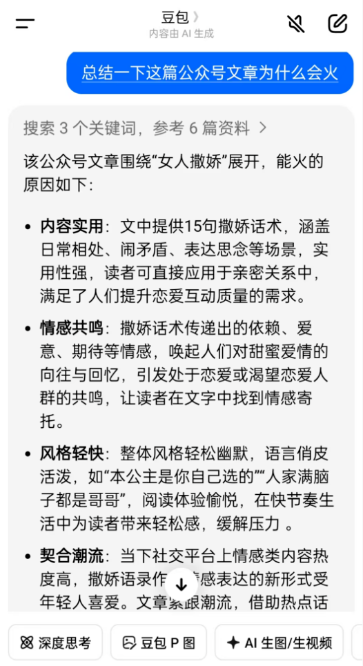 打开“豆包”App,把对标账号的文章链接复制进去,发给豆包。