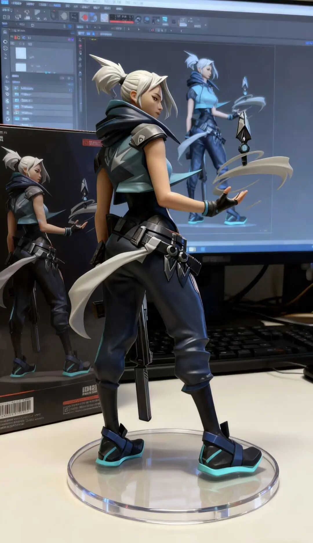 超写实PVC手办,1:1原比例还原原型,细节拉满(清晰纹理/精准色彩/真实PVC材质质感,反光细腻不生硬),放置于圆形透明亚克力底座上;背景为桌面场景,搭配手办专属包装盒,后方电脑屏幕显示对应人偶的3D建模软件界面(含设计稿细节),整体氛围贴合桌面摆放真实感,光影自然,突出手办造型立体感与材质通透感
