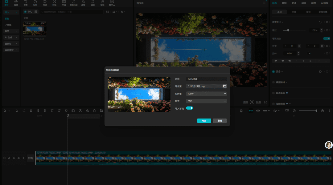 实战教程1.提示词撰写网址:https://www.doubao.com/文案生成常用kimi、腾讯元宝、chatgpt或者豆包等等工具进行生成,这边我主要是为了方便我做案例,因此才选择豆包。首先导入剪映,导出对标视频的某帧画面,为了反推提示词使用,很多人做这类治愈风景画面,难点在于不会写提示词,那我们就可以先看看对标的画面组成元素