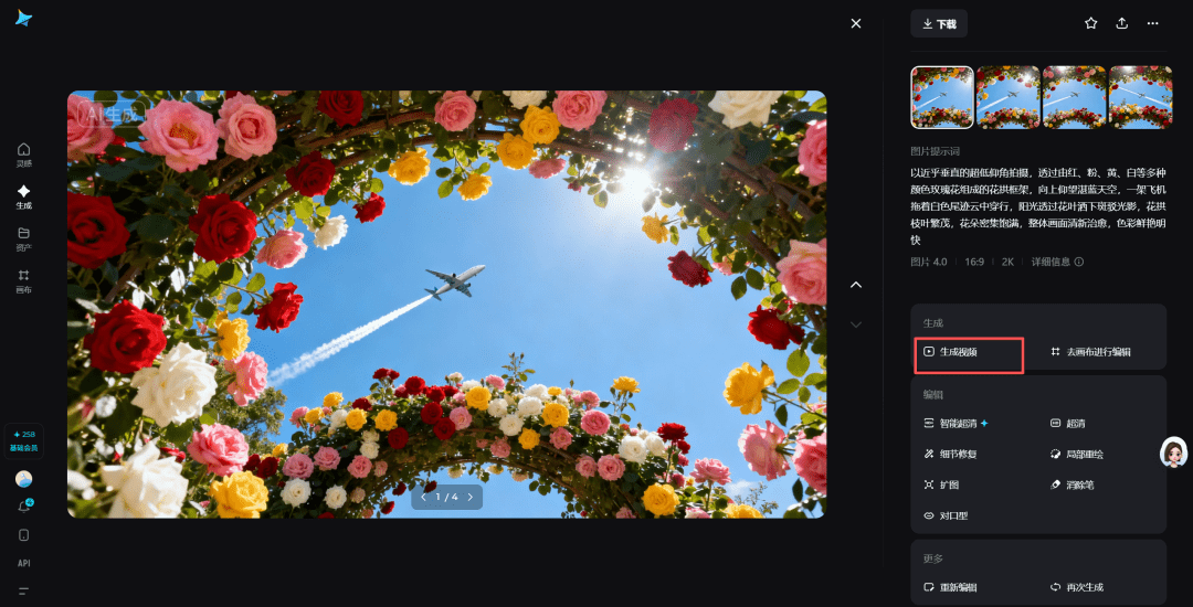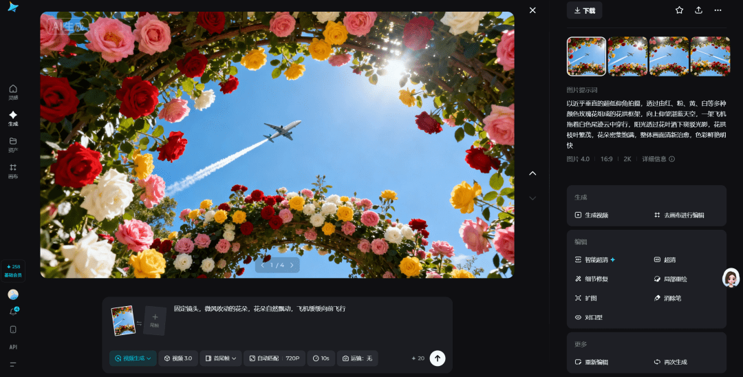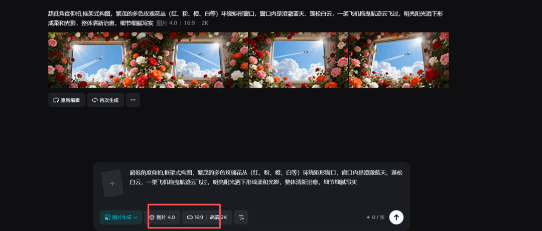 2.画面生成网址:https://jimeng.jianying.com/ai-tool/generate/?type=image图片模型选择图片4.0输入提示词:超低角度仰拍,框架式构图,繁茂的多色玫瑰花丛(红、粉、橙、白等)环绕矩形窗口,窗口内是澄澈蓝天、蓬松白云,一架飞机拖曳航迹云飞过,明亮阳光洒下形成柔和光影,整体清新治愈,细节细腻写实