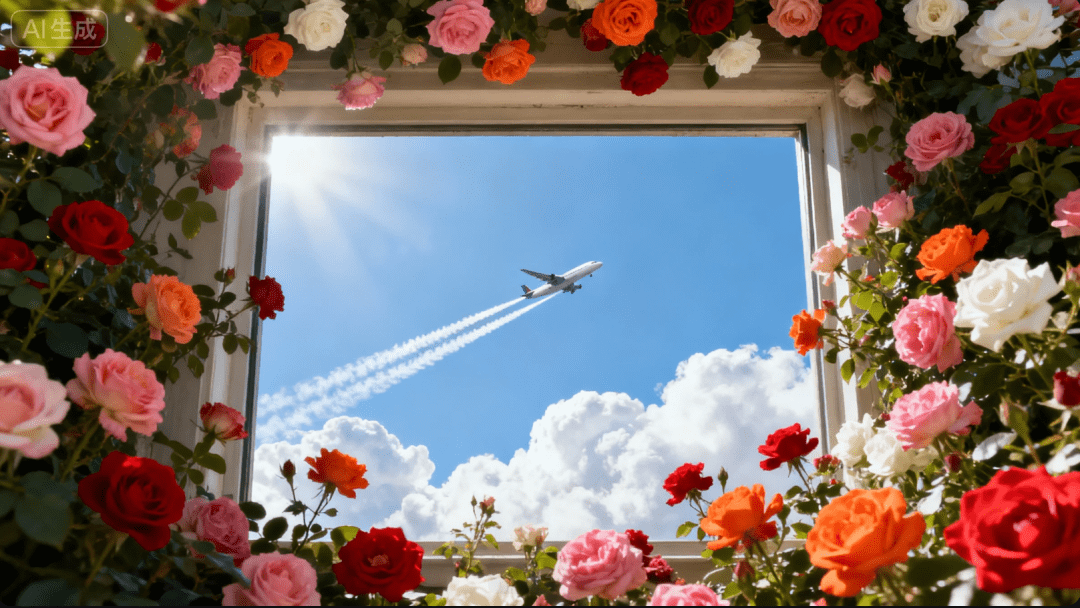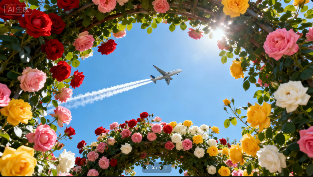 为了让大家可以更好参考,再给出一组提示词:超低角度仰拍,透过由红、粉、黄、白等多种颜色玫瑰花组成的花拱框架,望向湛蓝天空,一架飞机拖着白色尾迹云中穿行,阳光透过花叶洒下斑驳光影,花拱枝叶繁茂,花朵密集饱满,整体画面清新治愈,色彩鲜艳明快