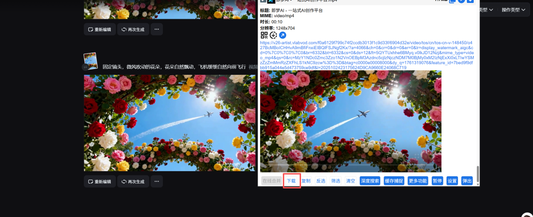 视频模型选择视频3.0,输入画面描述:固定镜头,微风吹动的花朵,花朵自然飘动,飞机缓缓自然向前飞行
