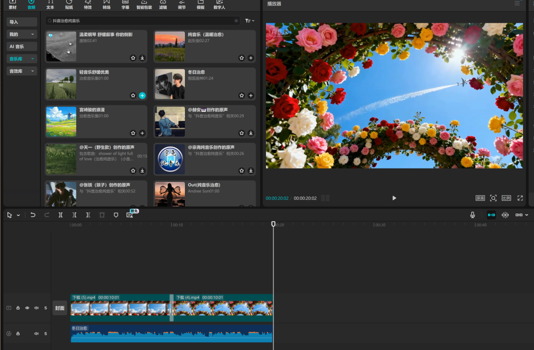 3.打开剪映导入所有的视频片段,添加转场进行拼接,搜索治愈的背景音乐,拖入轨道对齐即可