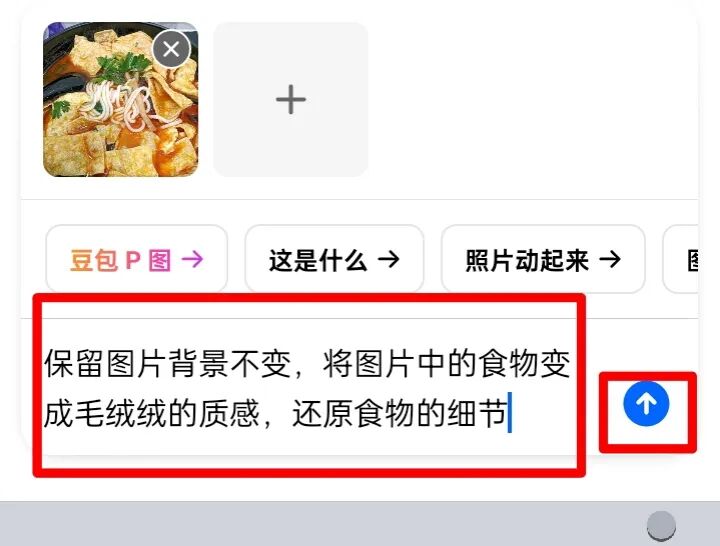一、豆包制作教程画面提示词:保留图片背景不变,将图片中的食物变成毛绒绒的质感,还原食物的细节。步骤清晰且直白,照着做就好啦-打开豆包软件,点击聊天对话框-添加参考图-输入对应的提示词-然后点击发送