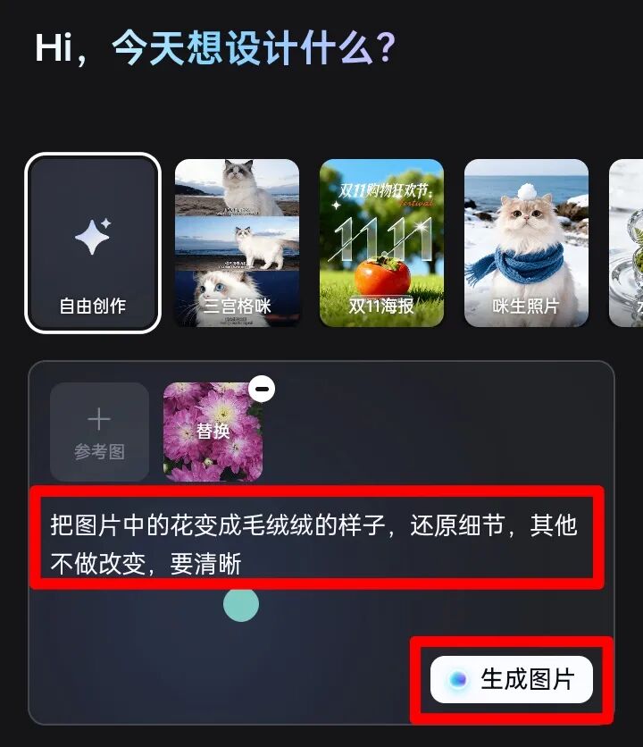 -在“自由创作”中添加参考图-输入对应的提示词-zui后生成图片