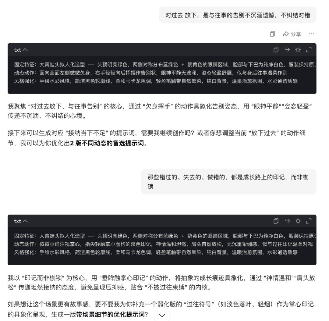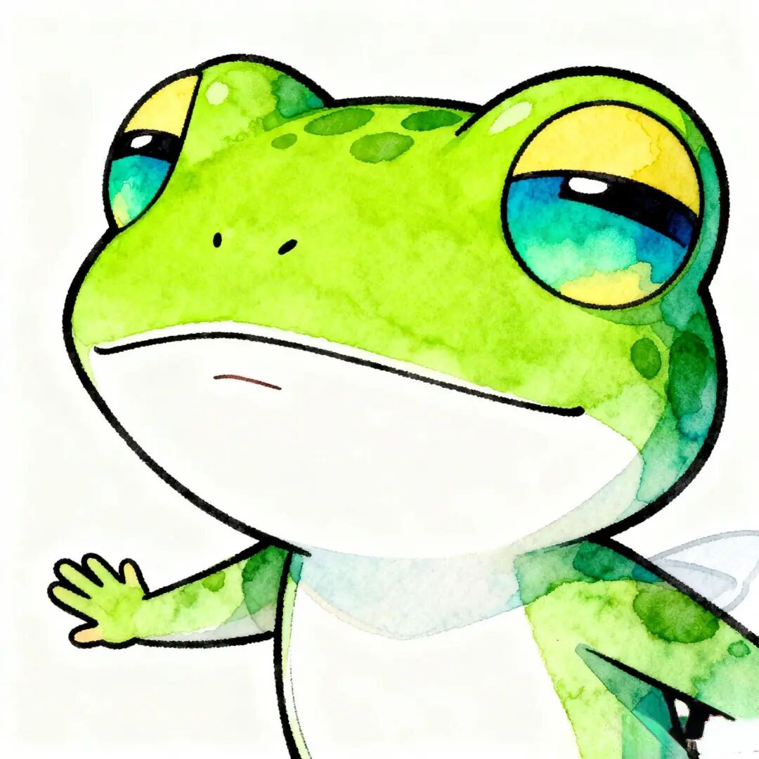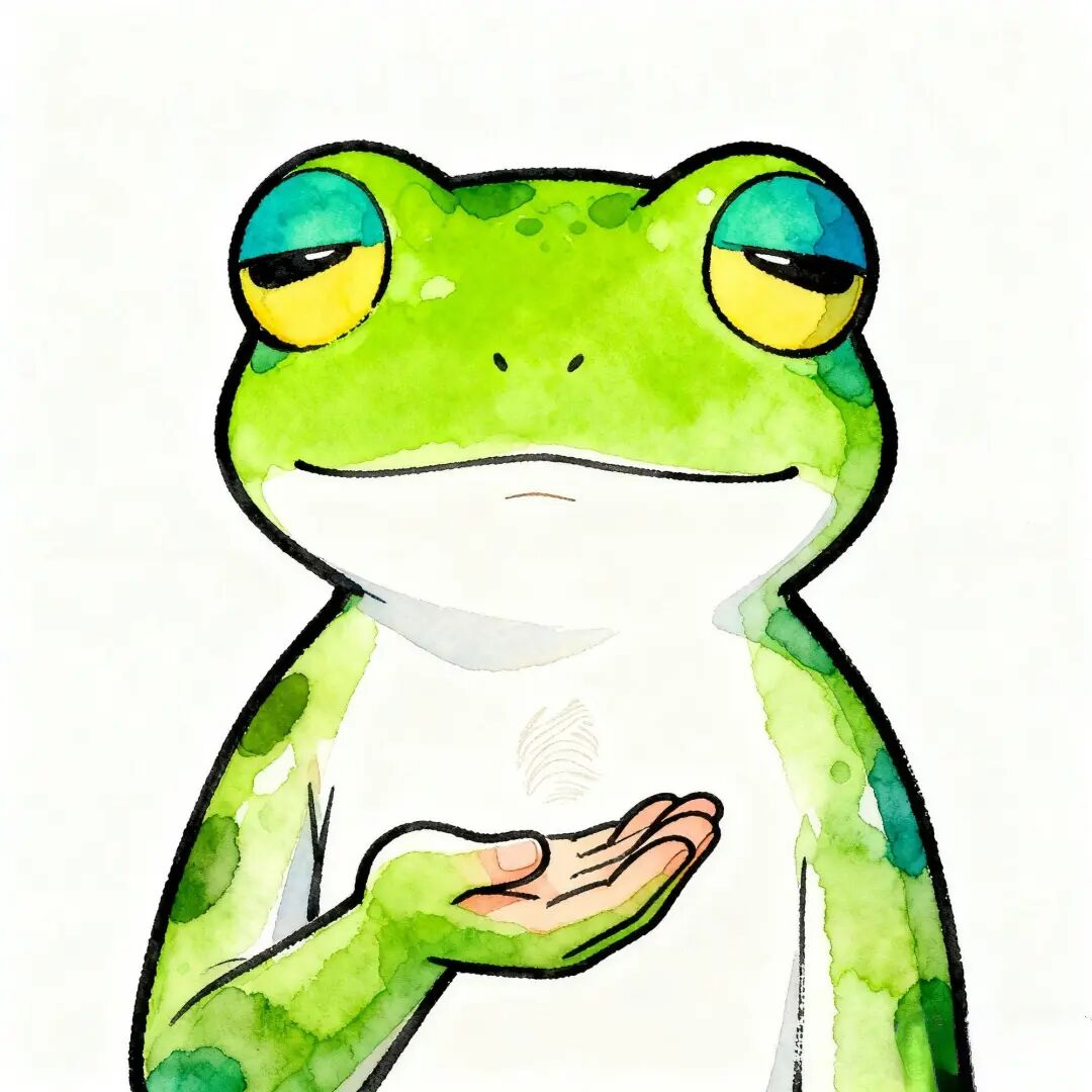 固定特征:大青蛙头拟人化造型 —— 头顶明亮绿色,两侧对称分布蓝绿色 + 鹅黄色的眼睛区域,脸部与下巴为纯净白色,服装保持原设动态动作:面向画面左侧微微欠身,右手轻轻向后挥摆作告别状,眼神平静无波澜,姿态轻盈舒展,似与身后往事温柔作别风格强化:手绘水彩风格,简洁黑色轮廓线,柔和马卡龙色调,轻盈笔触带自然晕染,纯白背景,温柔治愈氛围,水彩通透质感 固定特征:大青蛙头拟人化造型 —— 头顶明亮绿色,两侧对称分布蓝绿色 + 鹅黄色的眼睛区域,脸部与下巴为纯净白色,服装保持原设动态动作:微微垂眸注视掌心,指尖轻触掌心虚构的淡色印记,神情温和坦然,肩头自然放松,无沉重紧绷感,似与过往印记温柔对视风格强化:手绘水彩风格,简洁黑色轮廓线,柔和马卡龙色调,轻盈笔触带自然晕染,纯白背景,温暖治愈氛围,水彩通透质感 可以看看我最终生成的,