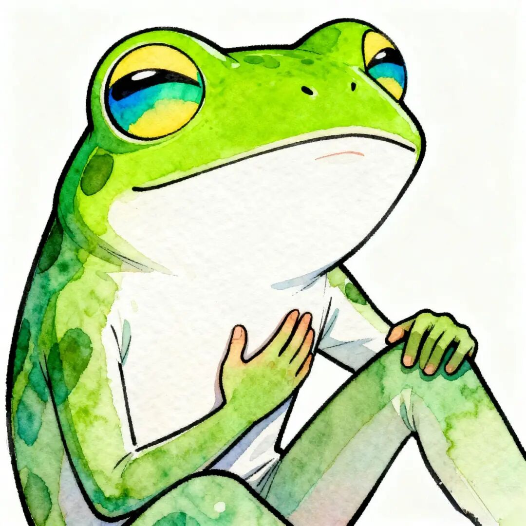 固定特征:大青蛙头拟人化造型 —— 头顶明亮绿色,两侧对称分布蓝绿色 + 鹅黄色的眼睛区域,脸部与下巴为纯净白色,服装保持原设动态动作:侧身静坐,一手轻搭膝盖,一手温柔抚摸胸口,眼神柔和望向远方,神态舒展放松,似放下纠结的释然状态风格强化:手绘水彩风格,简洁黑色轮廓线,柔和马卡龙色调,轻盈笔触带自然晕染,纯白背景,温柔治愈氛围,水彩通透质感 同个形象需要新的动作表情的话,可以在同个对话里继续比如: