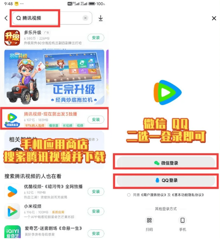 在应用商店搜索”腾讯视频”,下载安装后用微信或QQ登录。