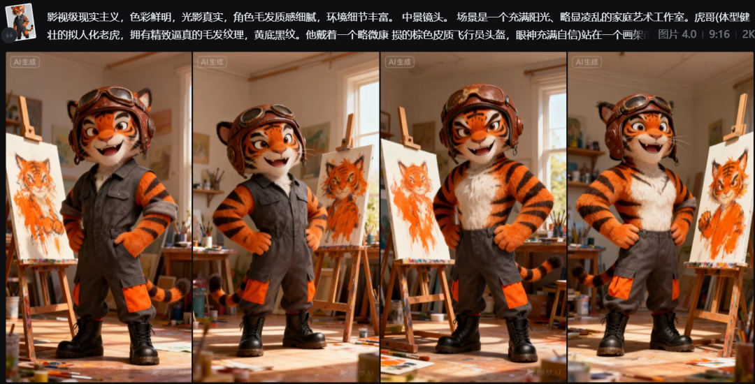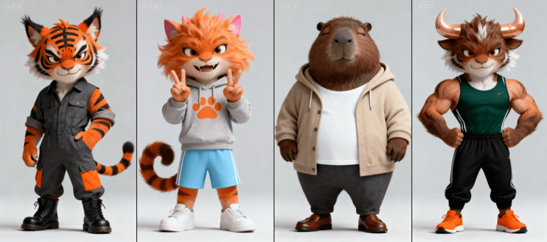 我们也学习原博主的人物设计,分别设计四个主角:兔子、老鼠、老虎、花猫。瓜子这只是一个参考,大家可以自己设计自己的专属IP形象在即梦内输入如下指令: