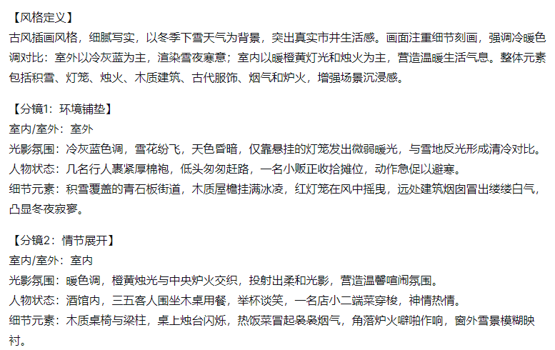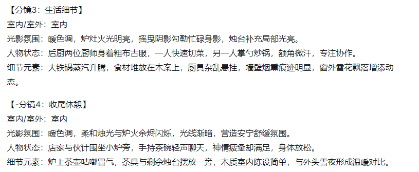 – 每个分镜需包含:场景类型、光影氛围、人物动作/状态、细节元素;