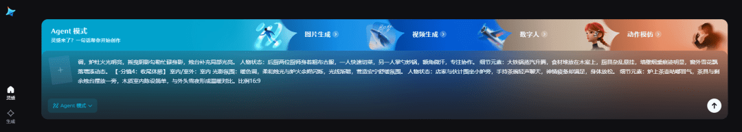 1.打开即梦,选择Agent模式,输入分镜提示词,后缀加上16:9,点击生成。