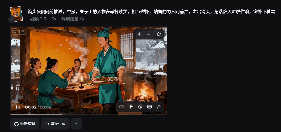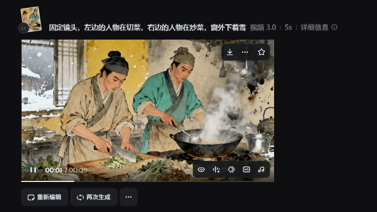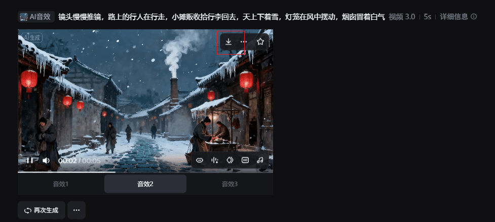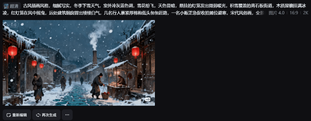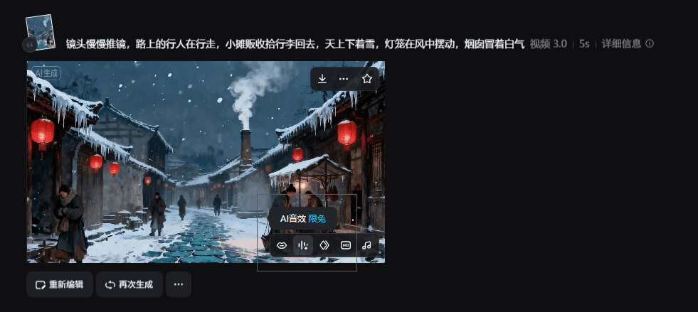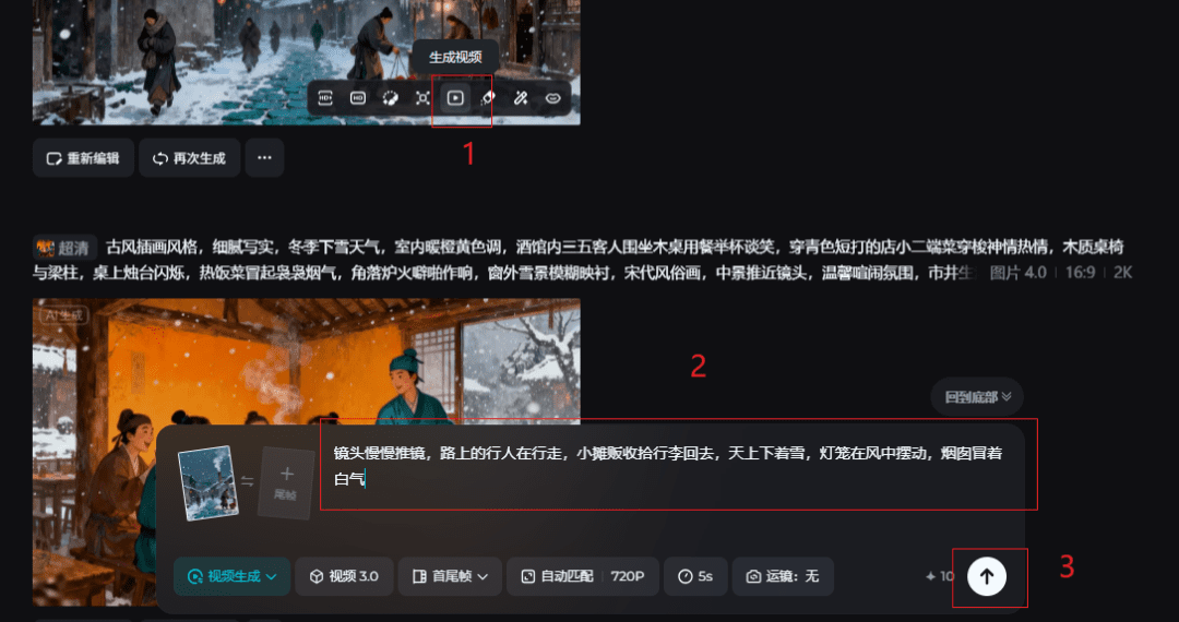 4.点击生成视频,输入提示词:镜头慢慢推进,路上的行人在行走,小摊贩收拾行李回去,天上下着雪,灯笼在风中摆动,烟囱冒着白气。