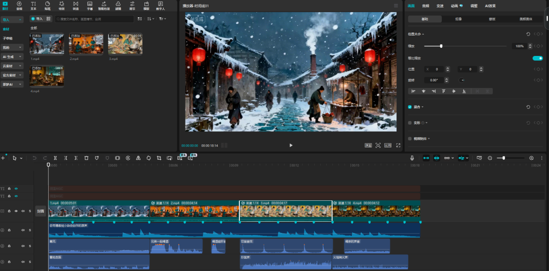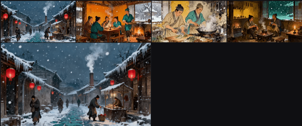 所有生成的画面必须固定冬季、下雪天气,具有真实市井生活感。