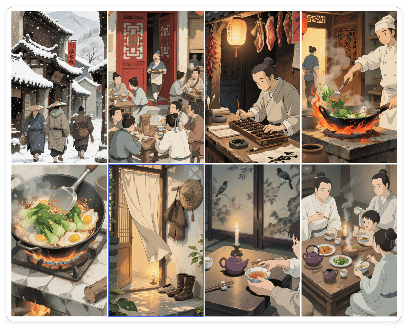 2.不要先想画面,先想你想让观众感受到什么。一个好故事往往建立在一个核心的情感对比或转变上,看起来很简单的治愈系店小二的生活,但仔细品是有很大的情感对比(室外冷清孤寂,室内温暖团聚)3.画面风格不局限于我给的风格,很多国风风格都可以尝试对比,看看那种氛围感更好,如果不会改提示词的,可以把提示词扔给豆包,让豆包去改,你只需要告诉东宝,你想要的剧情步骤,他自己会设计分镜。比如: