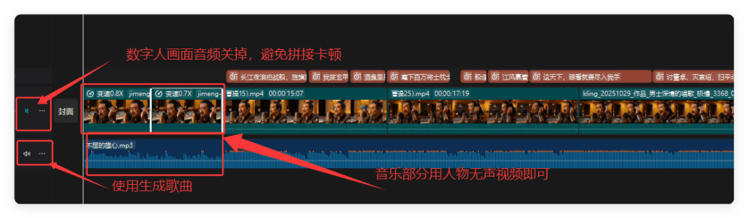 1.把数字人生成片段导入,以及音乐部分生成的无声视频画面导入2.关闭数字人主轨道音频,避免拼接带来的音频卡顿3.拼接音乐部分的视频时长可以调整变速,要对齐音乐,数字人口型的对齐开唱部分