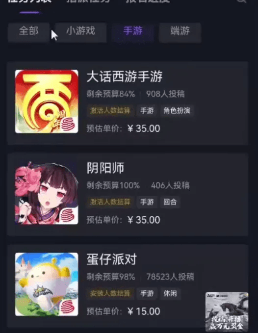 大号在星图中承接各类游戏任务,比如梦幻西游和易水寒,这些游戏的佣金非常高,一单大约有50元左右。