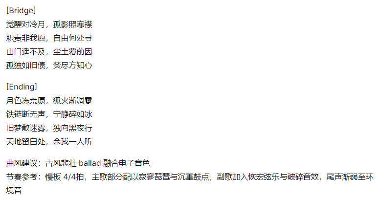 你是一名古风影视歌词创作者,请你以‘影视人物独白歌曲’的风格创作歌词。要求如下:【一、创作主题】1. 主体为妲己(封神榜角色);2. 主题围绕‘诱惑的假象与真心的破碎’‘被当作工具的悲剧’;3. 突出妲己‘表面魅惑,内心孤寂’的反差,有自我独白感。【二、文体与风格】1. 第一人称;2. 风格参考《美猴王》,语言具象、克制,有画面感;3. 情绪递进:压抑→怀疑→觉醒→孤寂;4. 短句为主,有韵律,每两句对仗(比如‘狐尾扫过红尘劫,真心葬入帝王阙’)。【三、结构要求】分 [Verse 1](开篇点题:荣耀与枷锁)、[Chorus](情绪爆发:信仰与反讽)、[Verse 2](觉醒与孤独)、[Ending](尾声留白),共 24-30 行。【四、意象建议】用‘狐尾’‘朱砂’‘王座’‘枯骨’‘月光’‘旧梦’等,承载悲剧感。【五、输出格式】开头标‘《狐焰烬》词:妲己 曲:妲己 演唱:妲己’,加曲风建议(如‘古风抒情 + 电子元素,节奏缓慢,尾音绵长’)。