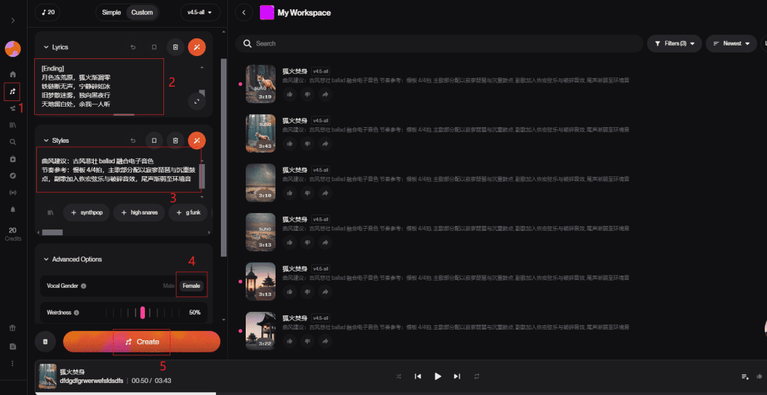 1.打开suno,将生成的歌词粘贴至Suno,选择合适的曲风,点击生成。