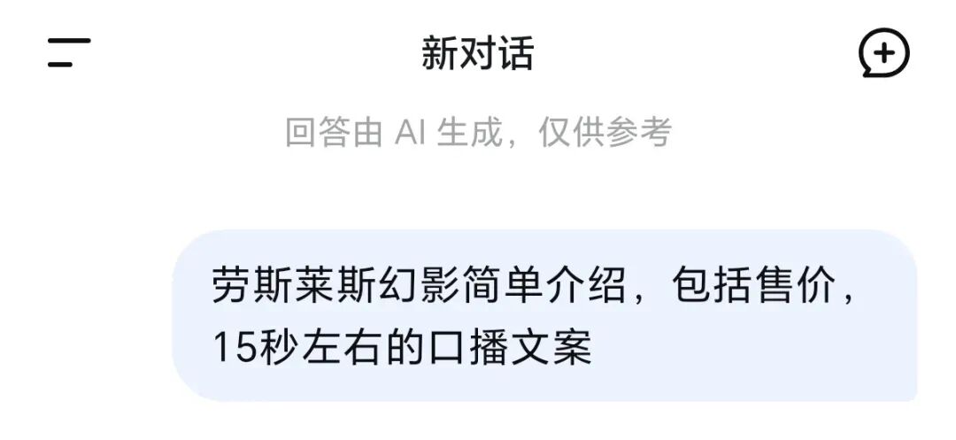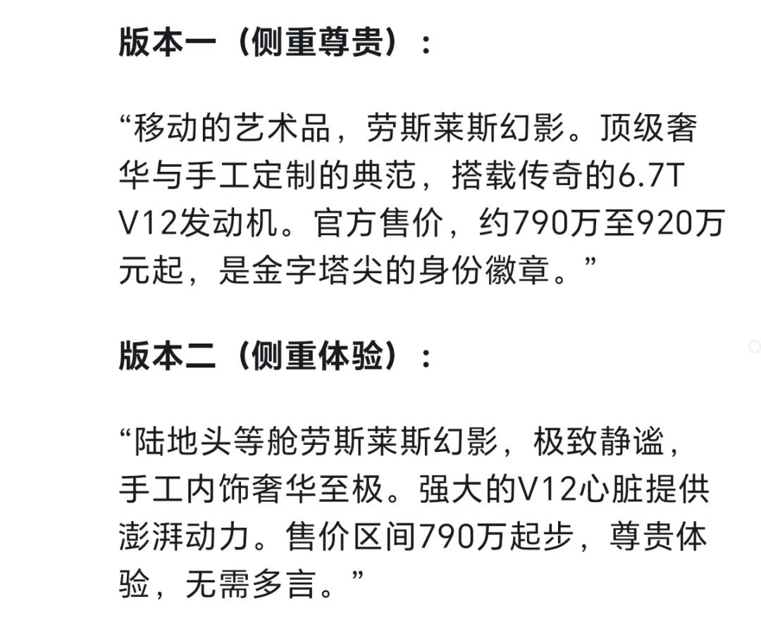 素材确定后(比如选了劳斯莱斯幻影的视频),打开DeepSeek、腾讯元宝等AI工具,输入提词(例:“劳斯莱斯幻影的气场有多绝?流畅的车身线条搭配奢华内饰,每一处细节都尽显高端,这才是顶级豪车的质感”),AI会生成多个文案版本,随便选一个复制即可。
