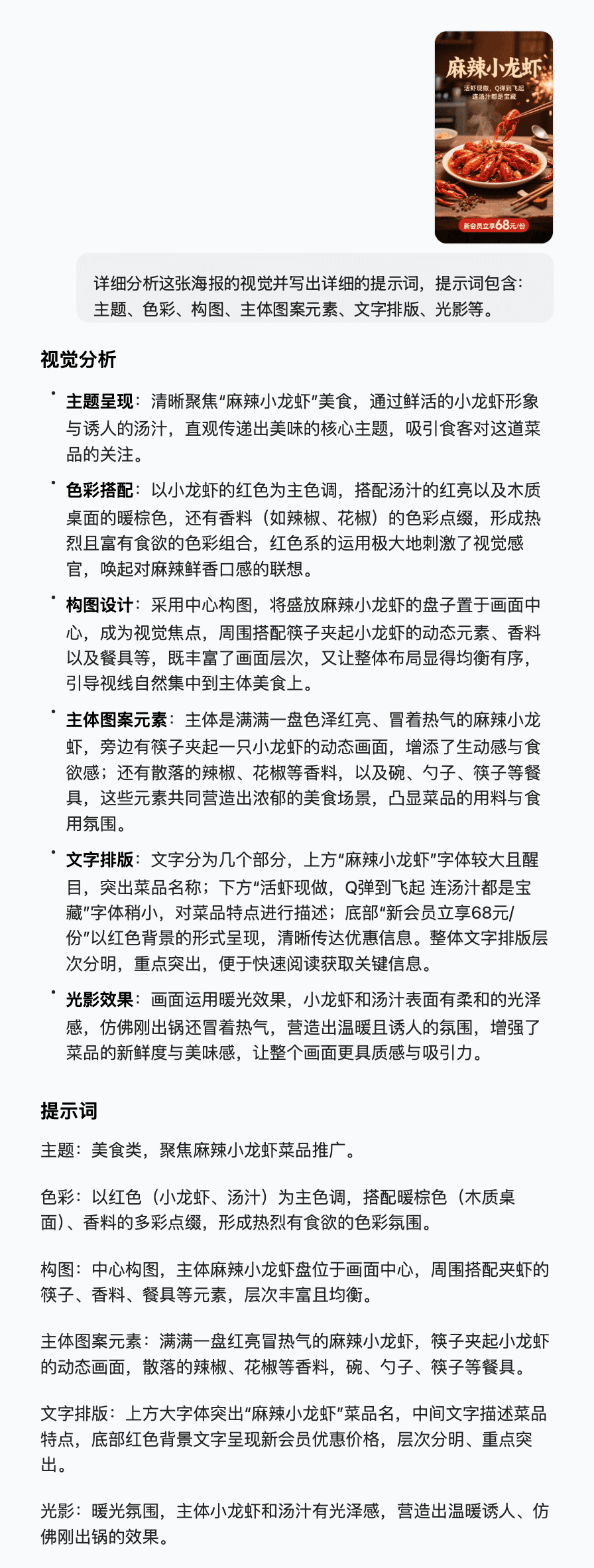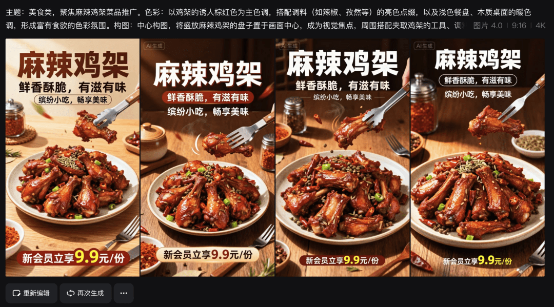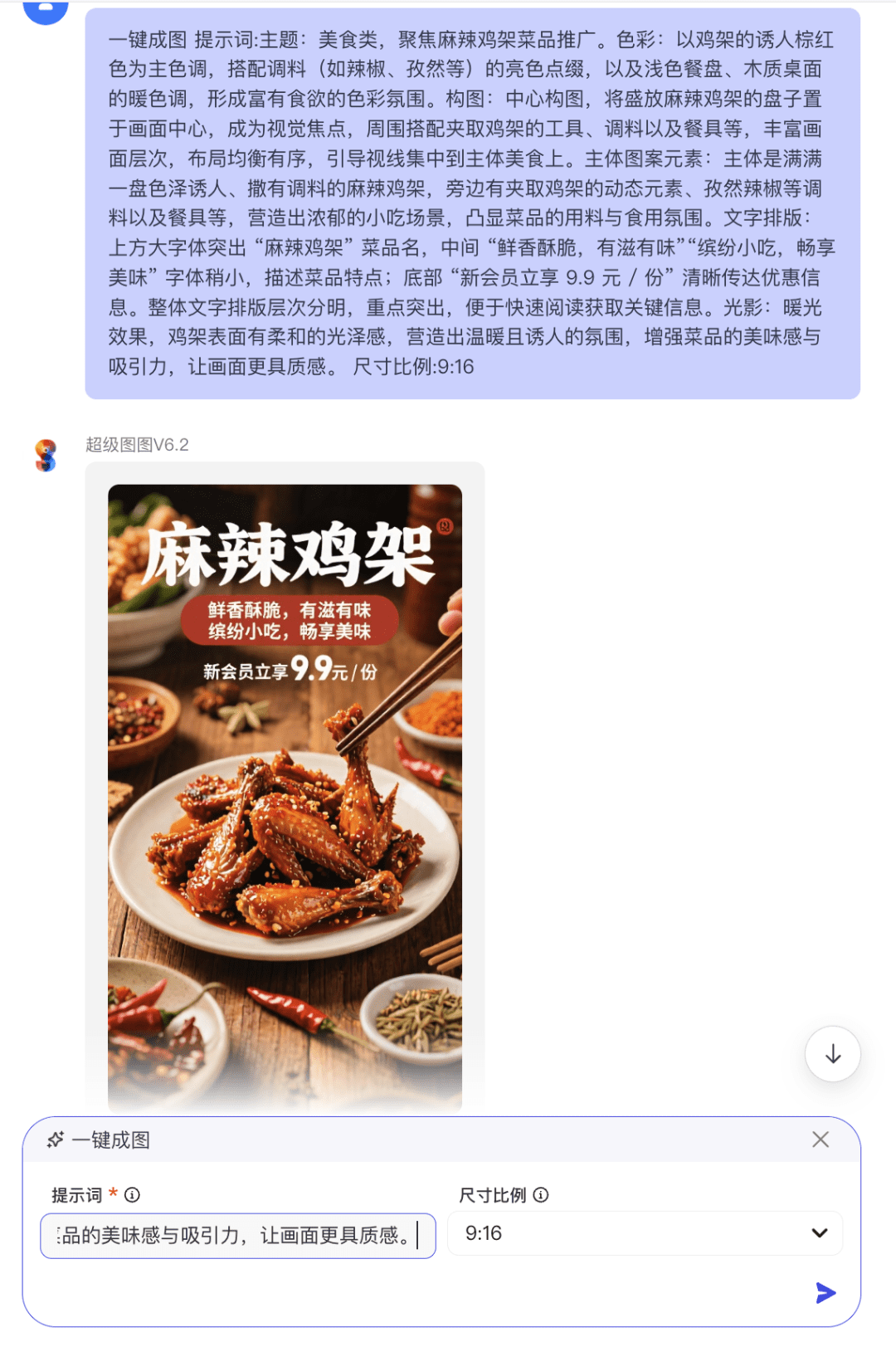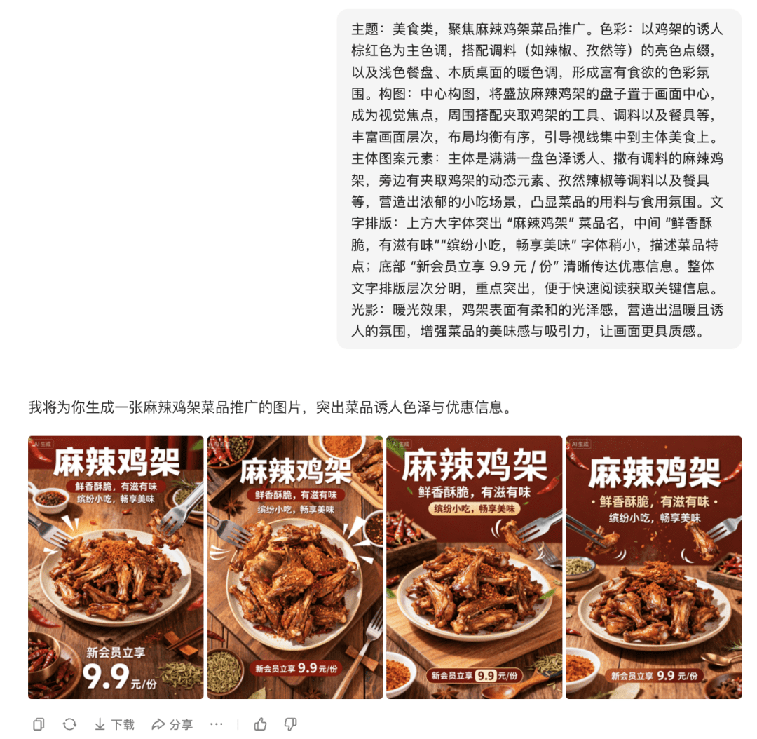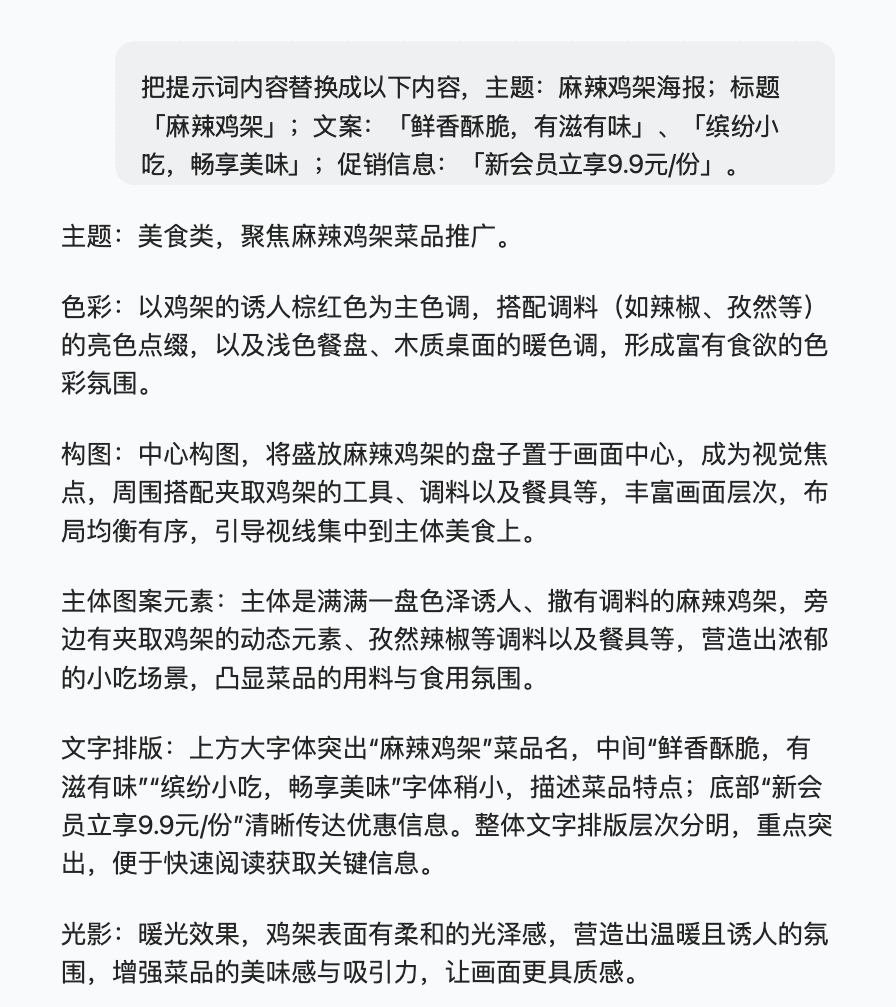 比如:“把提示词内容替换成以下内容,主题:麻辣鸡架海报;标题「麻辣鸡架」;文案:「鲜香酥脆,有滋有味」、「缤纷小吃,畅享美味」;促销信息:「新会员立享 9.9 元/份」。”