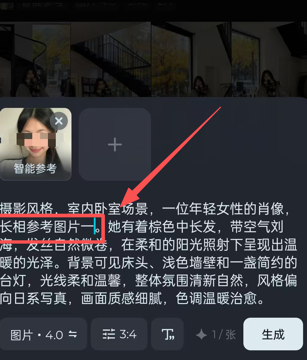 手机打开即梦app,复制我们上面生成好的提示词,参考图那里上传小红书下载的素材图片,在提示词中间加一句:长相参考图片一。