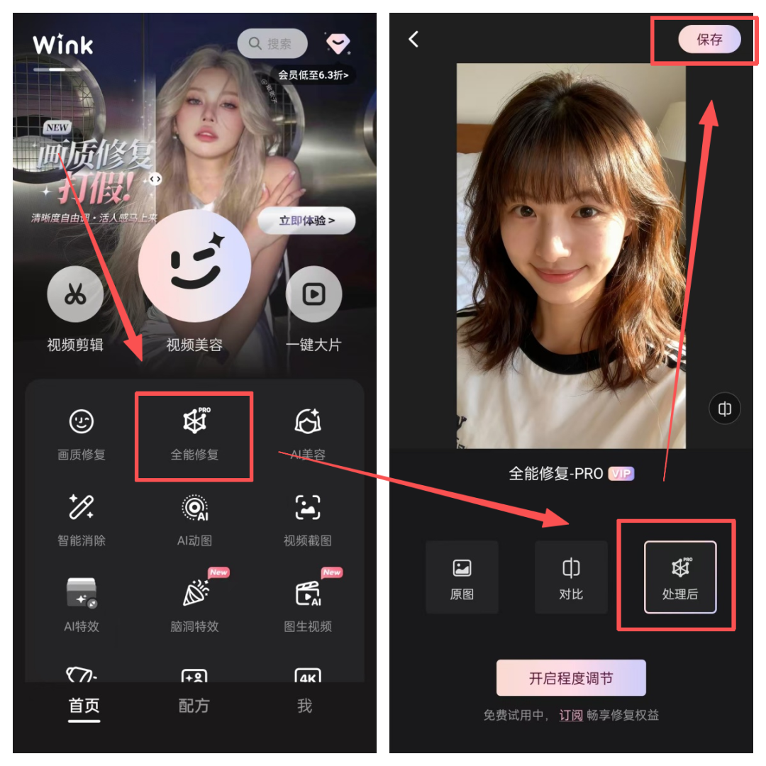 手机打开wink,选择全能修复,上传刚才AI生成好的图片,AI很快就帮我们处理好了,然后点右上解保存即可。