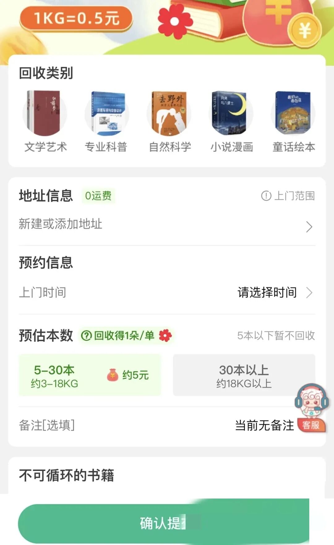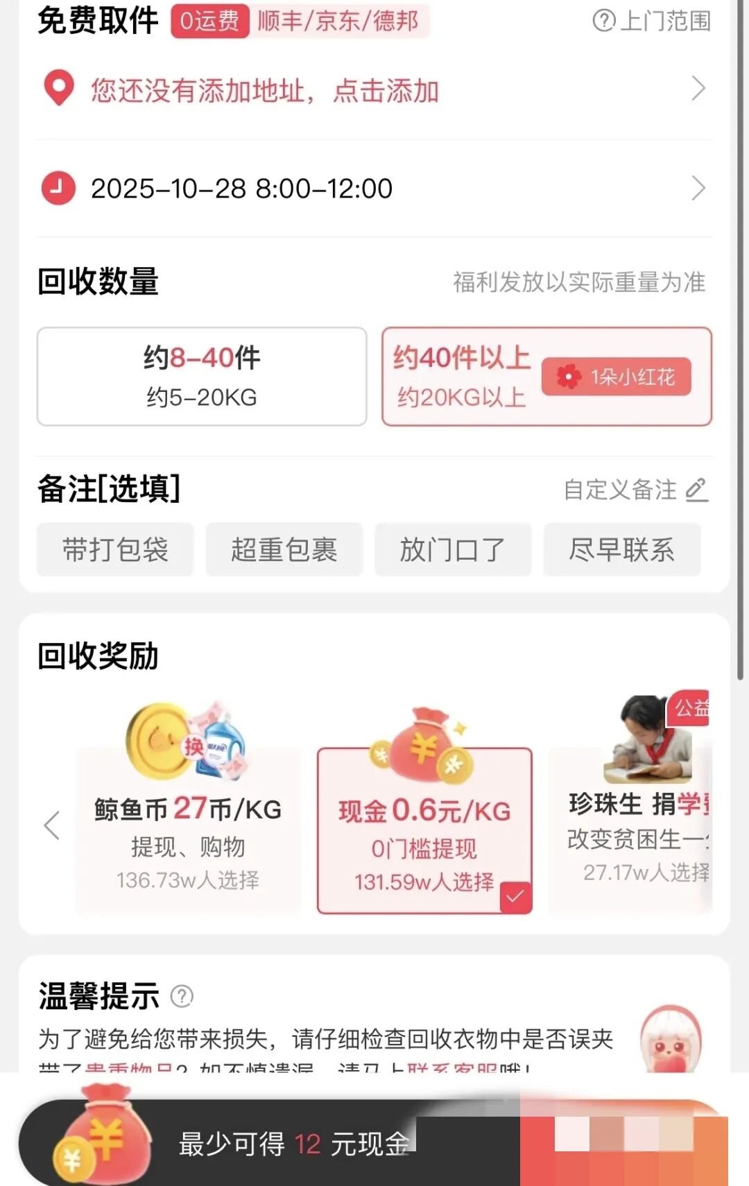 最近发现了一个回收旧衣旧书的小程序,价格也不高,大概1kg收入0.5左右。