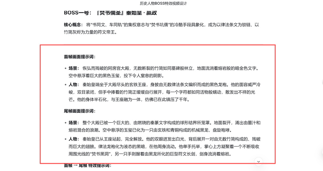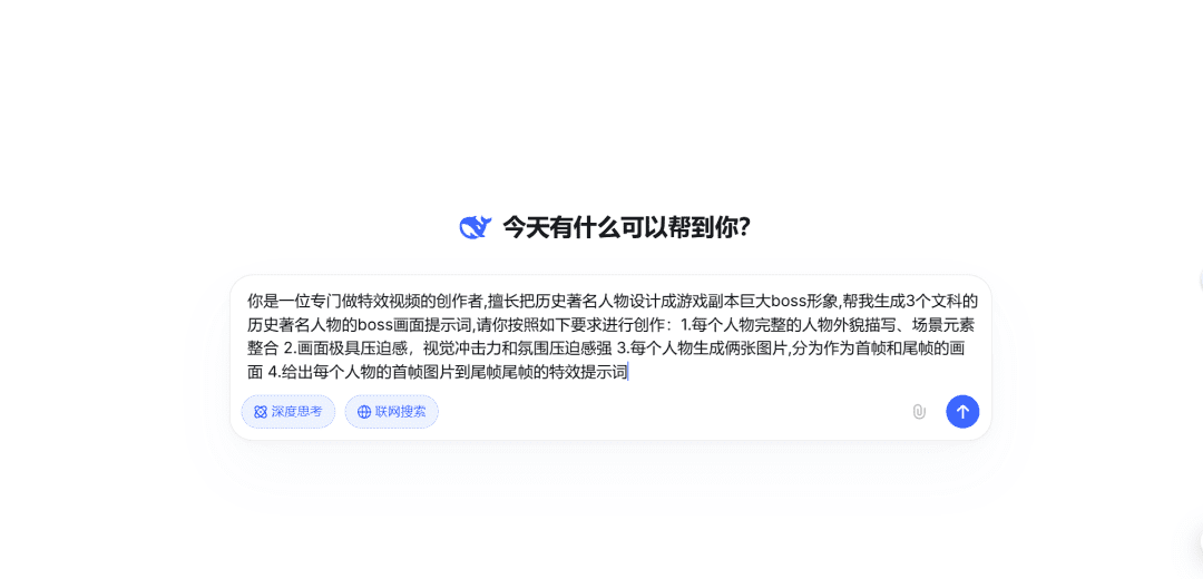 实战教程1.提示词生成提示词生成常用kimi、deepseek、claude、chatgpt或者豆包等等工具进行生成,这边我使用deepseek网址:https://www.deepseek.com/输入提示词:你是一位专门做特效视频的创作者,擅长把历史著名人物设计成游戏副本巨大boss形象,帮我生成3个文科的历史著名人物的boss画面提示词,请你按照如下要求进行创作:1.每个人物完整的人物外貌描写、场景元素整合 2.画面极具压迫感,视觉冲击力和氛围压迫感强 3.每个人物生成俩张图片,分为作为首帧和尾帧的画面 4.给出每个人物的首帧图片到尾帧尾帧的特效提示词打开深度思考模式