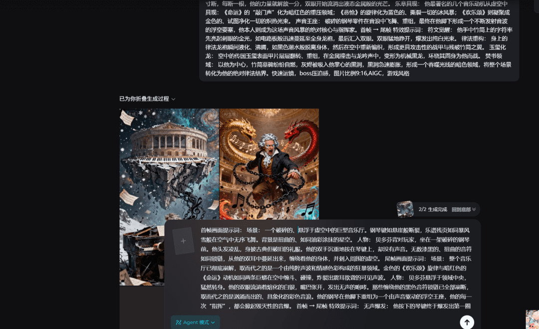 打开即梦agent模式,把deepseek生成的首尾帧的画面提示词扔他看,补充图片比例