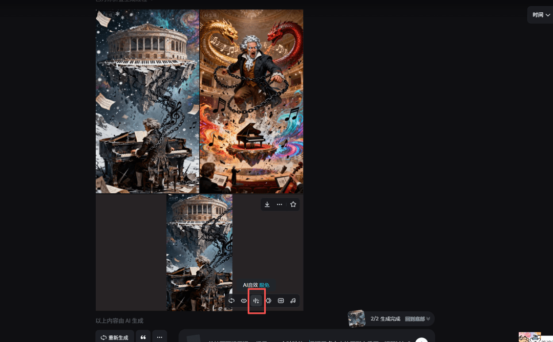 即梦会帮我们生成首尾帧的画面,并且还把俩个图片直接生成视频。借助ai给视频添加合适的音效
