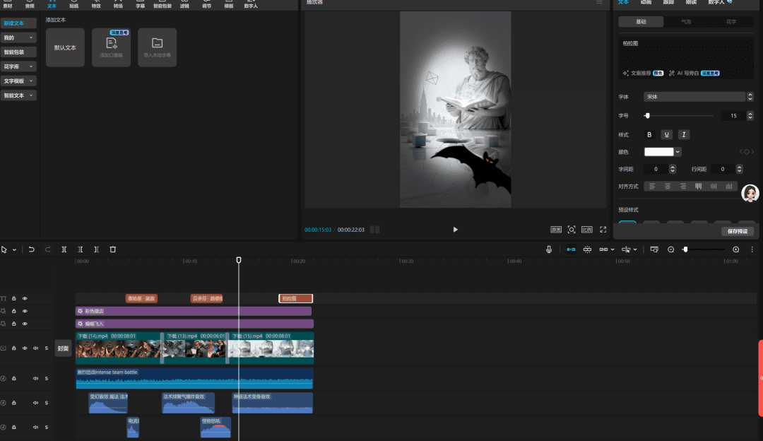 效果如下:效果不是特别好,建议换成海螺/vidu来制作效果会更好。依次生成所有的画面导出到本地3.剪辑成片拖入所有的视频片段,添加叠化转场进行拼接为了让画面感更有感觉可以适当添加一些特效,渲染画面氛围拖入一些合适的音效,进行画面对齐最后就是添加合适的文案,设计文案字体和颜色